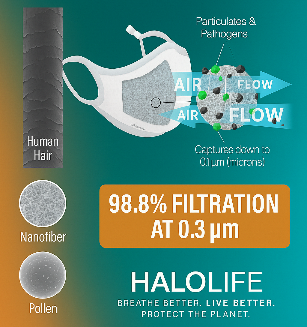 HALOLIFE designs breathable, reusable masks engineered with advanced nanofiber filtration technology to help protect against air pollution, wildfire smoke, allergens, and seasonal airborne irritants — without compromising comfort.